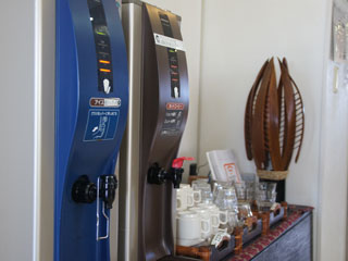 1Fフロント横にウエルカムドリンクとして、コーヒーとさんぴん茶をご用意しております。 ご出発の前後におくつろぎください。